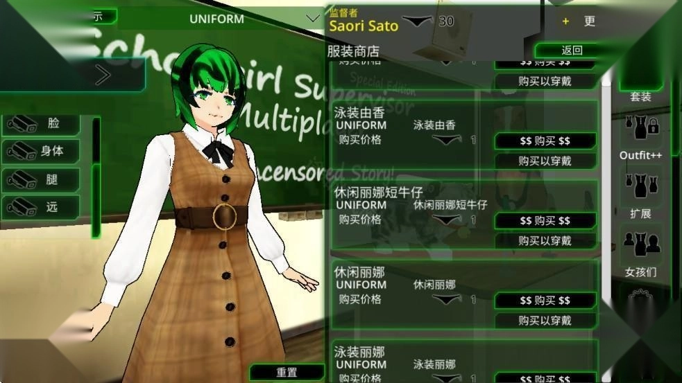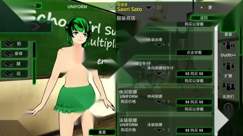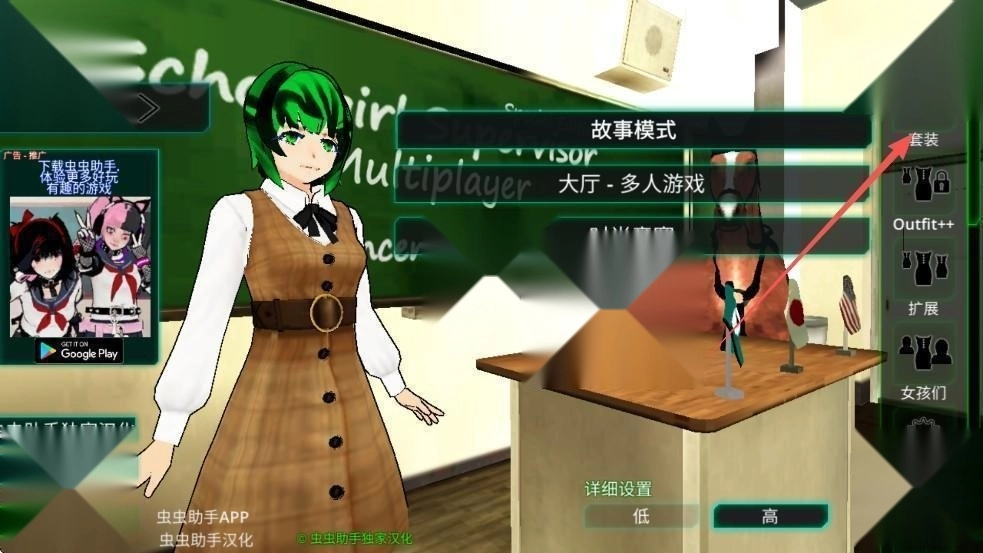 1、打开校园女生监督会汉化版游戏,点击【套装】