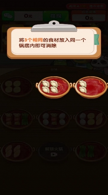 1、将三个相同的食材放入同一个锅底内即可消除,完成订单。