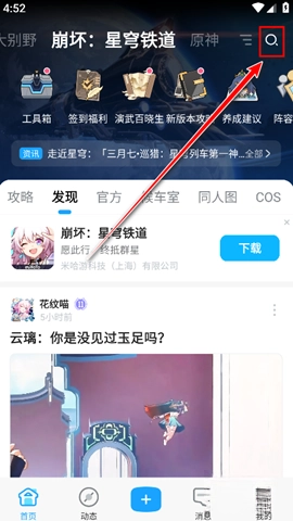 1、打开米游社,点击首页右上角的放大镜图标,进入搜索页面。