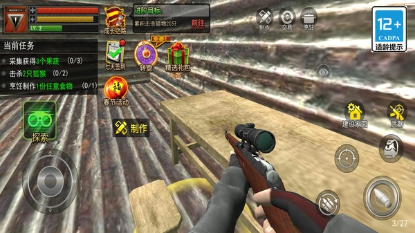 《射击挑战大冒险》是一款融合冒险与生存元素的射击游戏。在游戏里,玩家将化身一名野外猎人,在荒野中定居生活。为了生存,你需要外出狩猎获取资源。游戏提供了丰富多样的武器供玩家自由切换,每种武器都有其独特的性能与效果。你需要利用这些武器狩猎各类野兽,完成阶段性的里程任务,以此积累更多生存资源,在危机四伏的环境中存活下来。游戏画面制作精良细腻,感兴趣的小伙伴们不妨来体验一番!