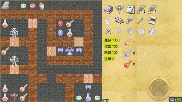 1在一楼时,往右侧中间区域移动,穿过黄色门后击败蝙蝠和初级法师,再次清除蝙蝠,进入黄门获取钥匙、生命恢复道具及红蓝魔法石,随后前往四楼。