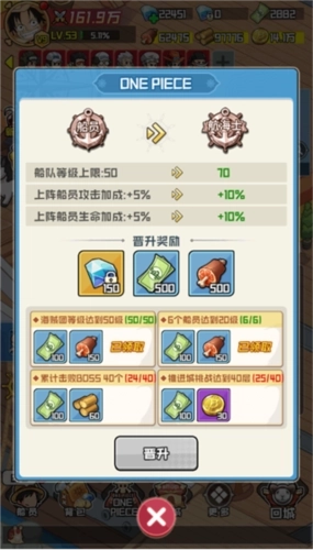 当船长等级达到25级时,将开启“晋升系统”,该系统简称为“ONEPIECE”