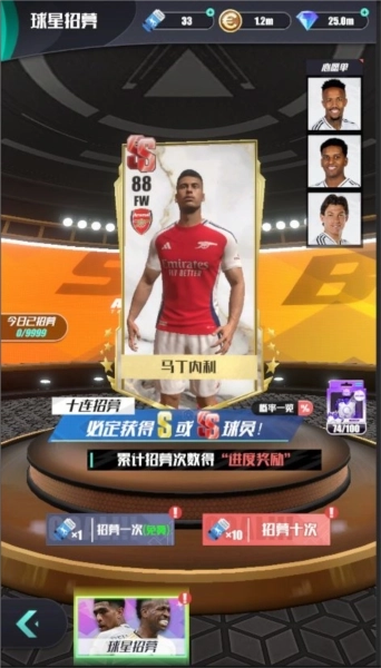 目前游戏内仅设有球星招募这一种招募卡池,不过在后续的版本更新里,我们将持续增加新的卡池,而且每个新增卡池中的球员评分也会各有差异,玩家能够自行挑选想要抽取的球员卡池。当玩家成功抽到球员时,S级和SS级的球员会在球员通道中呈现出对应的专属颜色,随后在球员展示界面还会清晰展示出该球员的国籍、所属球队等相关详细信息。