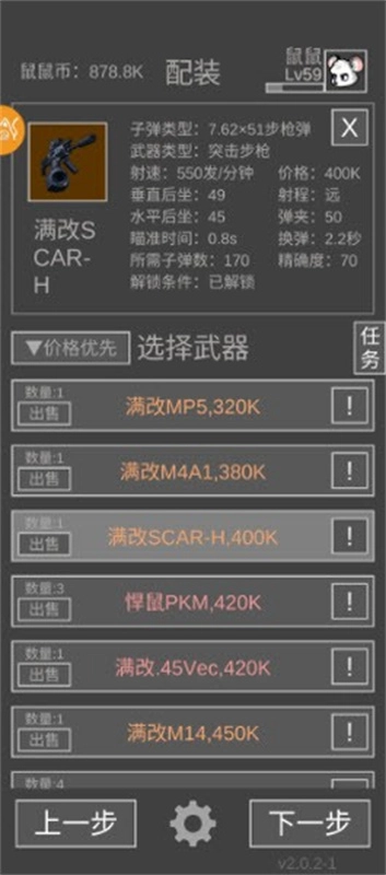 老鼠大冒险是一款趣味十足的文字类生存夺金游戏,又名鼠鼠模拟器。游戏高度还原了类似《逃离塔科夫》的场景,玩家能升级枪械、护甲、投掷物及各类装备,不断提升实力与财富。游戏的核心场景以文字形式呈现,你还可以自由调整战斗与移动方式,目标就是成为最强鼠鼠!