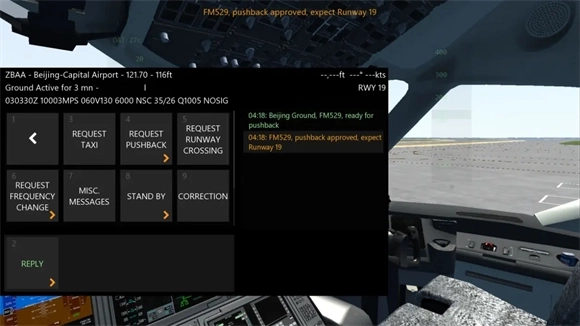 3、接下来申请滑行(requesttaxi),点击左侧界面的第二个按钮来提交滑行申请。按照惯例,待塔台回复后,我们查看回复内容并点击REPLY按钮执行指令。