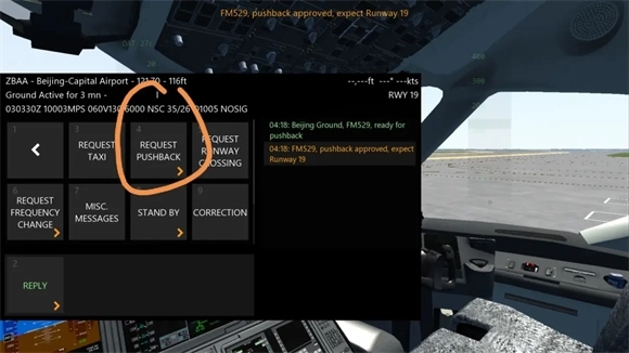 1、首先向塔台申请推出(Pushback),然后点击图里圈出的按钮。