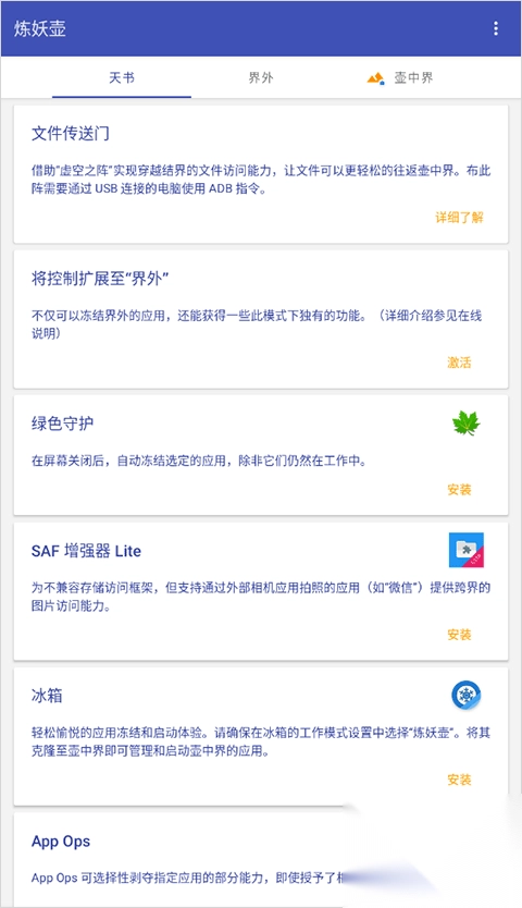 【天书】是一些和应用双开相关的实用工具,比如绿色守护、冰箱、文件传送门