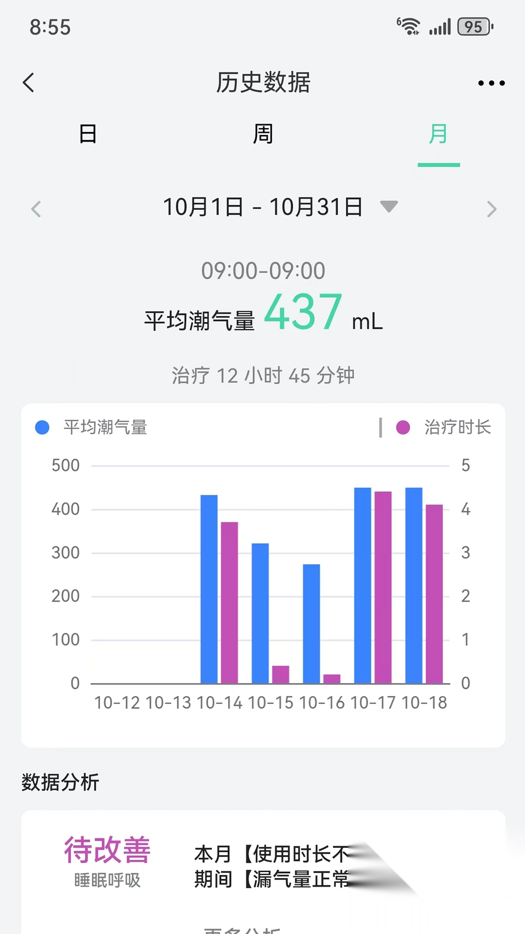 2、会对仪器每日记录的数据进行汇总,能够查看每日、每周或每月的呼吸数据,还能知晓治疗时间以及数值的标准程度,简单便捷。