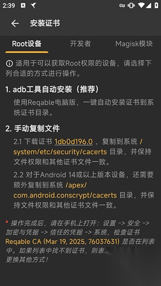 7、接下来,用户可依照官方给出的三种方式,先对自身手机设备进行root(鉴于安卓7之后,安卓开发团队规定手机抓包需root)。若有不想进行root的用户,也能够在magisk模块管理器里展开操作。