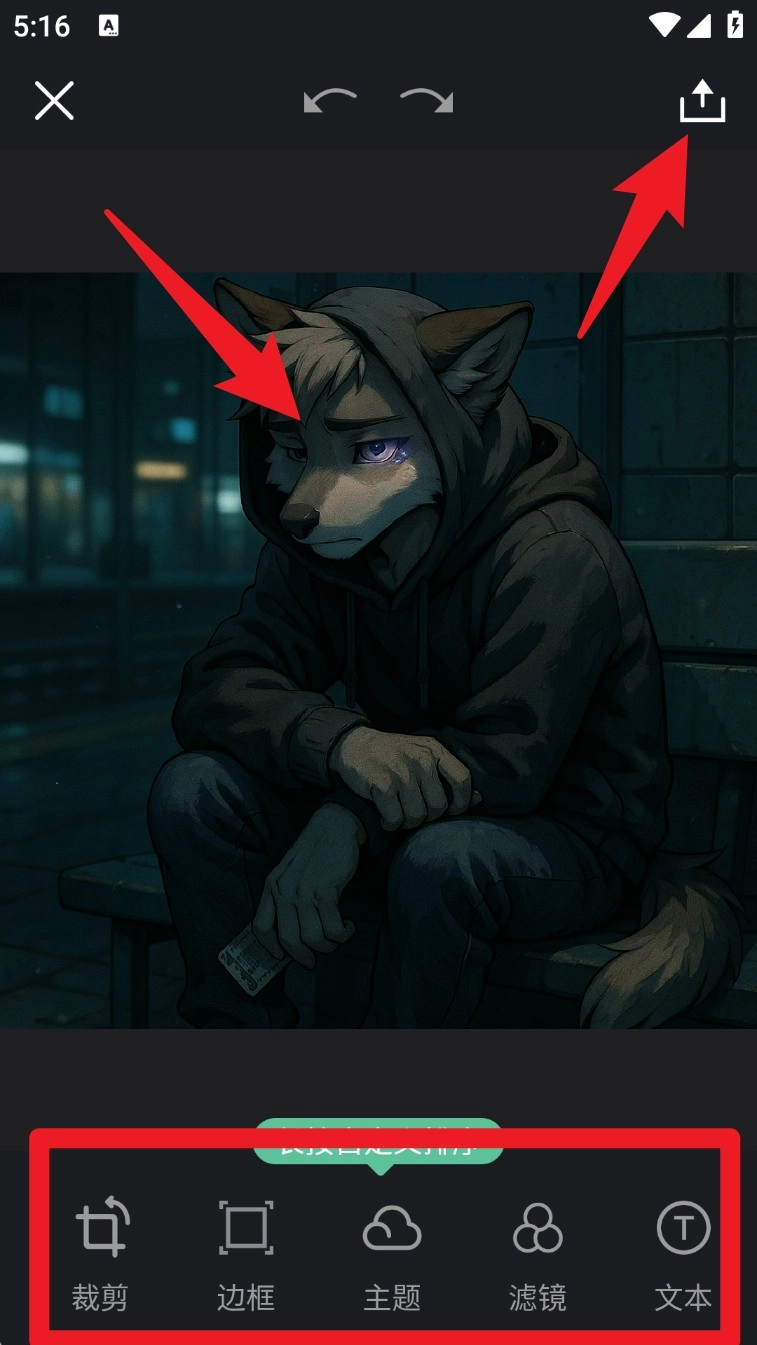 5. 完成编辑后点击右上角的分享按钮,可导出处理好的图片,还可套用滤镜或添加文字内容。