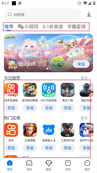 进入首页可以看到微信小游戏、0.1折爽游、学趣星球还有各种每日热门应用