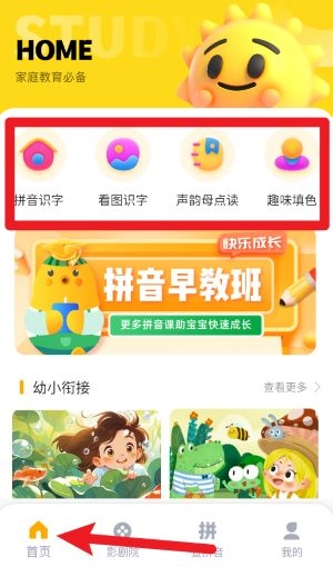 1. 开启APP,轻点首页的“拼音识字”这类图标,就能进入对应的识字、字母认读或者填色等互动学习板块。