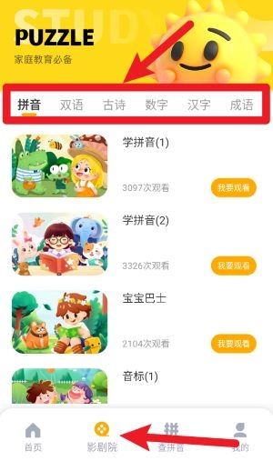 2. 当进入“影院”模块,你能够在拼音、双语、古诗等主题中进行选择,进而播放与之相关的趣味视频学习内容。