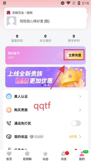 打开你的恋桃交友App,在个人中心点击金币充值功能。