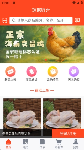 首页设有新品上架、商品分类、常购清单、再次购买等版块,方便用户了解最新上架的商品。