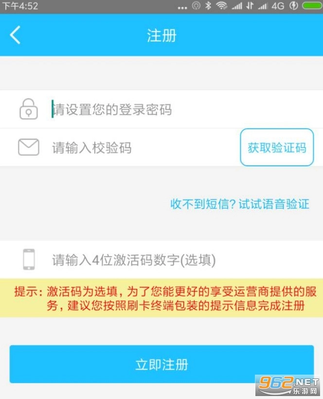 设置登录密码(需包含字母和数字)*,获取短信验证码,提示输入四位数字激活码(该选项为选填,无需填写),点击立即注册,注册成功。