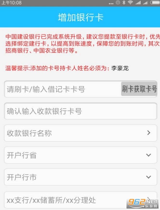 输入注册本人的银行卡信息。