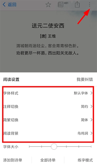要是想把软件里的诗词设成手机桌面壁纸,就得先编辑诗词的背景和字体,这可以通过右上角的按钮来设置(具体操作如下所示)。