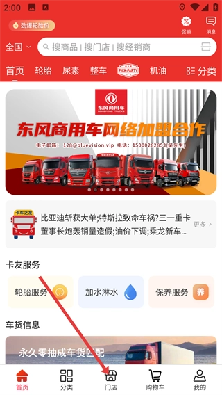在首页点击底部的【门店】按钮,进入门店板块后,即可开启卡车服务门店的查找流程。