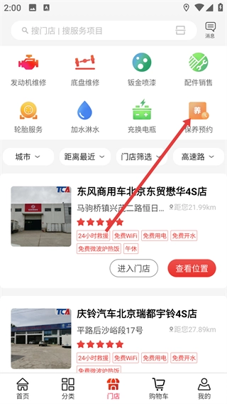 在门店板块中找到并点击【保养预约】功能选项,即可进入能提供保养服务的门店列表页面。