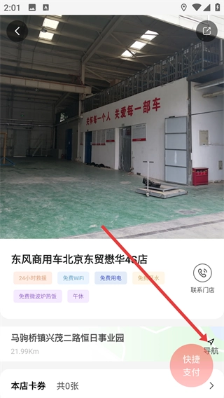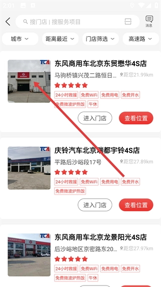 在门店列表里点击你要找的门店(比如东风商用车北京东贸懋华4S店),就能进入这家门店的详情页面。