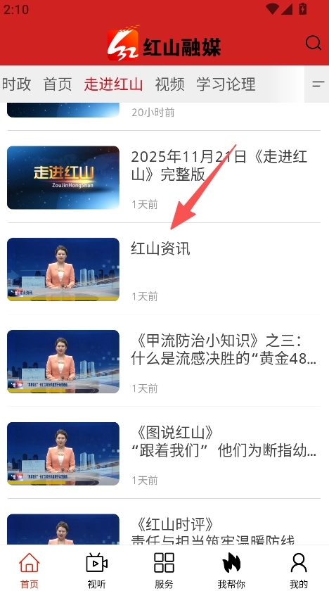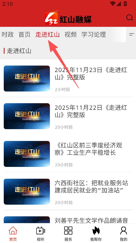 打开该软件后,找到并点击“走进红山”这一板块,随后对红山本地的资讯列表进行浏览。
