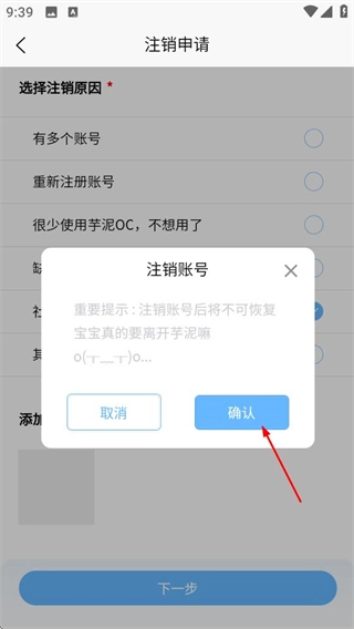 在注销原因选择页面,选定注销原因并点击下一步后,会弹出注销确认窗口。