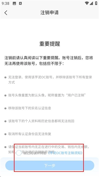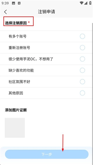 在注销申请页面,勾选相关协议后点击“下一步”按钮,即可进入注销原因的选择页面。