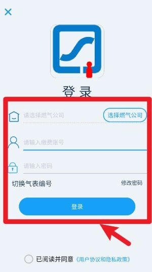 用户在登录界面需先选择所属燃气公司,再输入缴费账号和密码,最后勾选同意协议,完成这些步骤后方可进行登录操作。