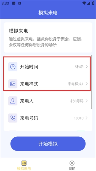 在【模拟来电】界面,能够对【开始时间】和【来电样式】进行设置,从而灵活调节虚拟来电的触发时间与显示效果。