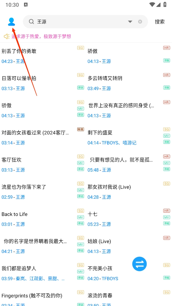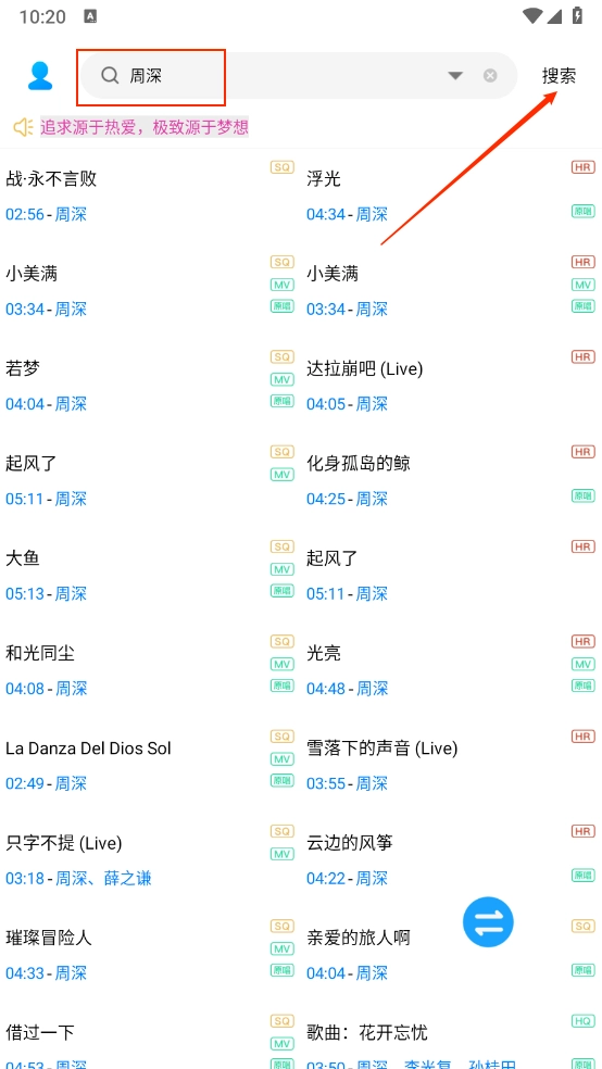 进入软件,点击上方搜索框输入歌名或歌星直接搜索。