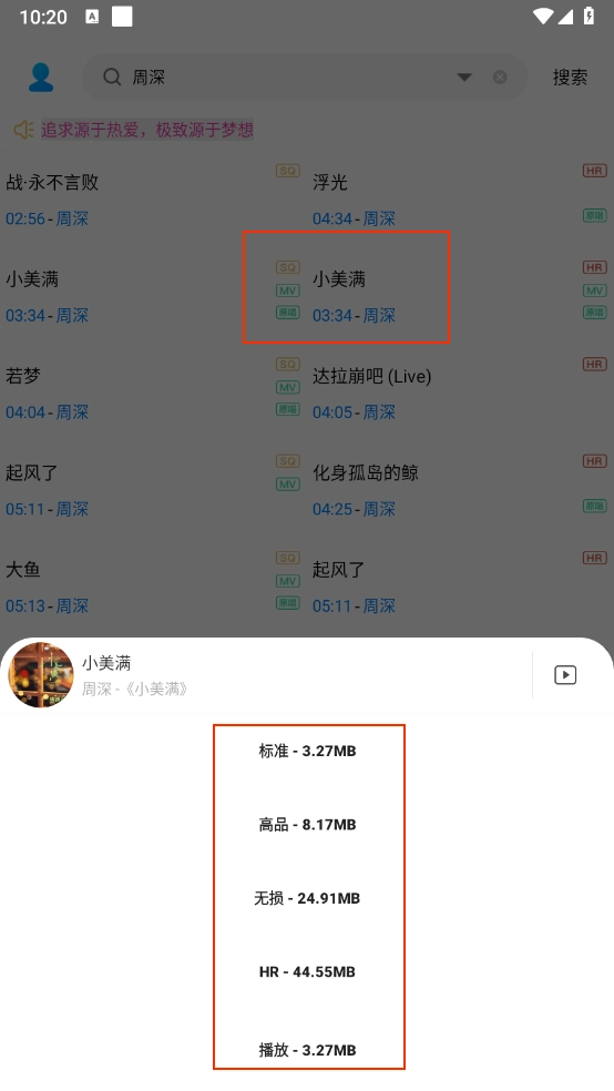 一键点击所需歌曲进入,选择相关音质进行即可。