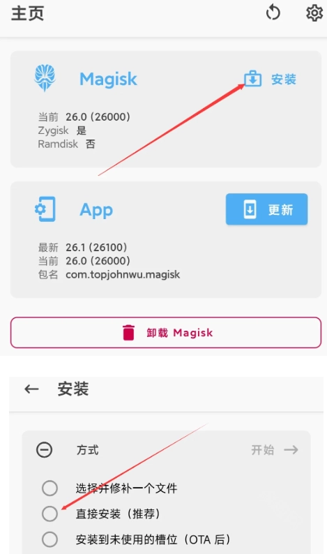 好的Kitsune Mask新版本,进入首页后,找到Magisk栏目里的「安装」选项(位置如图所示),点击进入新页面,然后选择「直接安装」开始安装流程,安装完成后重启手机即可。