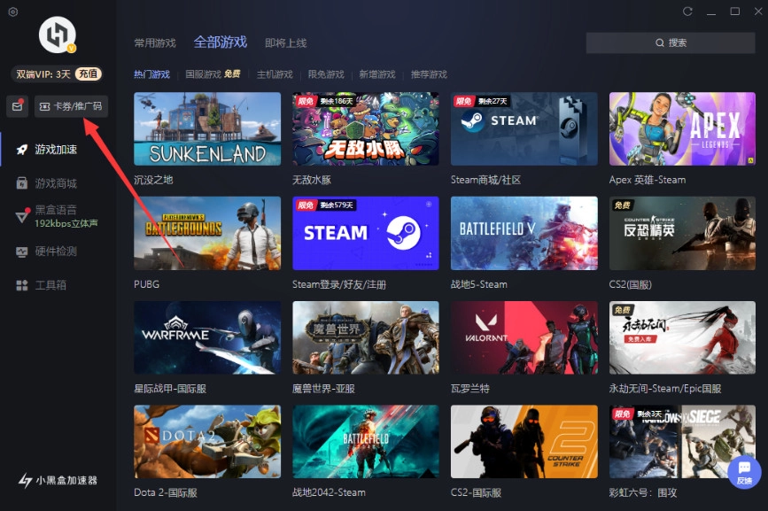 第一步:打开小黑盒加速器客户端并完成登录,之后在头像正下方找到【卡券/推广码】按钮并点击。