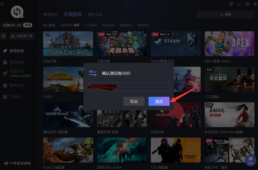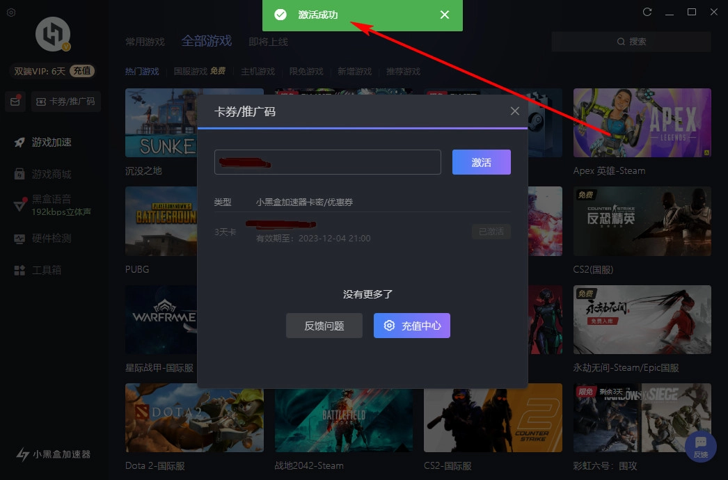 第四步:兑换成功后会出现【激活成功】的提示,您将获得小黑盒加速器3天卡,该卡会立即到账,您可以在头像位置查看VIP剩余时长。