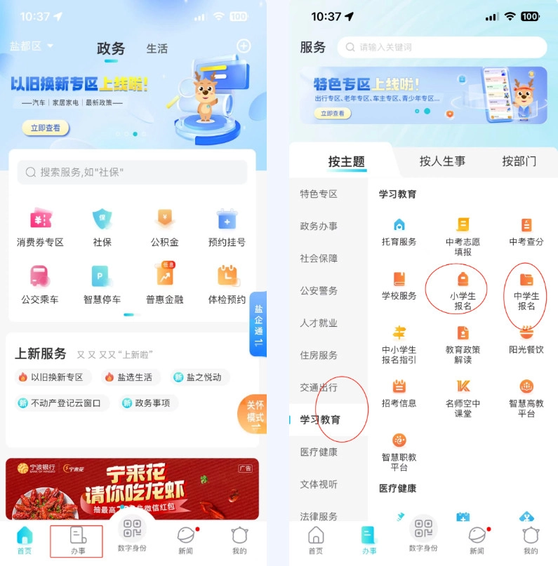 公办学校报名第一步 报名入口在首页点击“办事”,选择“学习教育”版块,根据需要选择“小学生报名”或“中学生报名”。