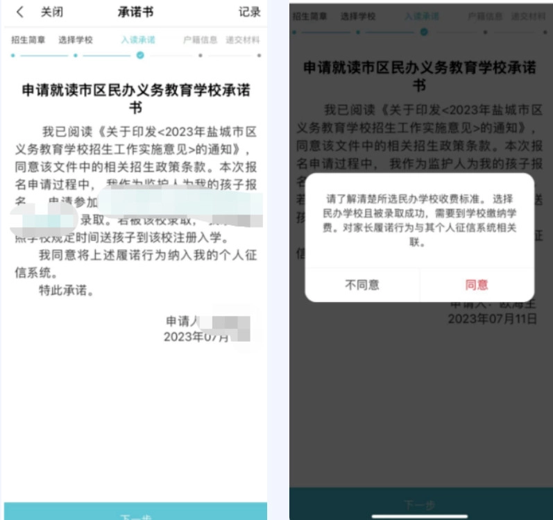 第五步 签订就读承诺书仔细阅读《申请就读市区民办义务教育学校承诺书》后点击下一步。(请了解清楚所选民办学校招生简章内容特别是收费标准,选择民办学校。报名成功后不可更改。如被录取,需到学校缴纳学费。)