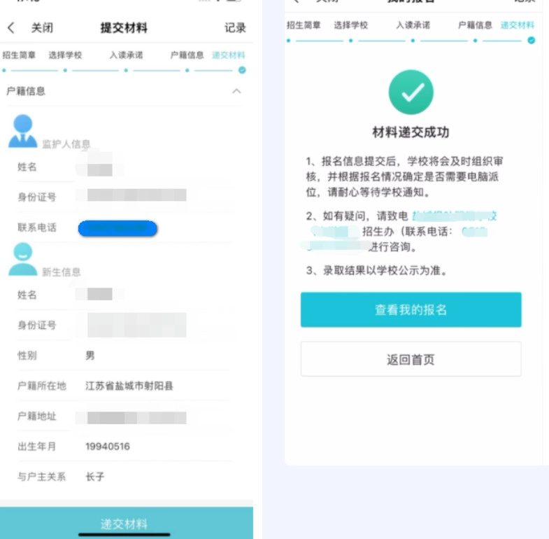 第六步 提交报名信息 提交前请再次确认填报信息(户籍信息、新生信息、房产信息)是否准确无误,点击“递交报名信息”,点击确认,报名信息提交成功。(报名信息递交成功后不能再作修改或重复报名,如提交后发现信息填写错误请线下报名。)