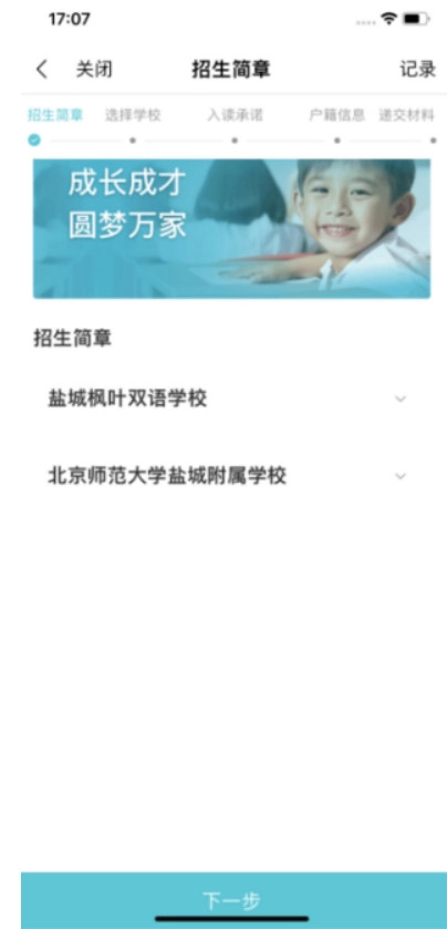 第四步 选报学校家长从列表中确认1所民办学校,并点击“已阅读招生简章”, 再点击下一步。