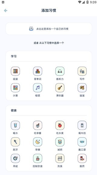 在添加习惯库中,有非常多的习惯养成项目,全都已经分好了类别,你可以自己挑选,也可以自己新建。