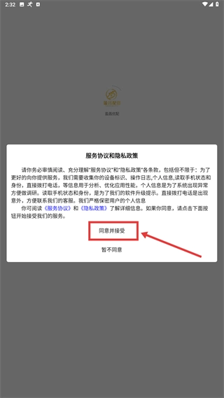 在服务协议与隐私政策的弹窗中,点击【同意并接受】按钮,以确认相关条款内容。