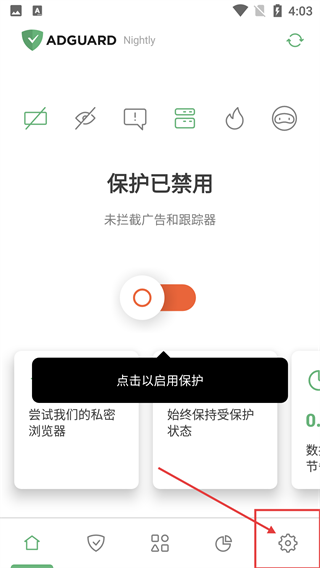 在AdGuard界面(当前保护已禁用),点击底部的【设置】按钮,就能进入设置页面,这款应用的作用是拦截广告和跟踪器。