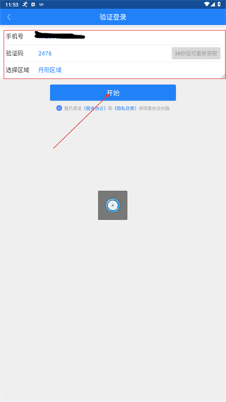 在验证登录页面,依次输入手机号、验证码,选择所在区域后,点击【开始】按钮,即可完成验证并启动租车流程。