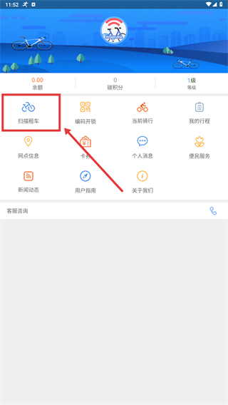 在主界面找到【扫码租车】的功能入口并点击,即可进入租车验证流程。