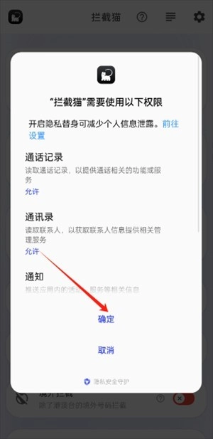 3、依据软件给出的提示,给“拦截猫”开启所有必要的权限,确保它的各项功能都能正常使用。