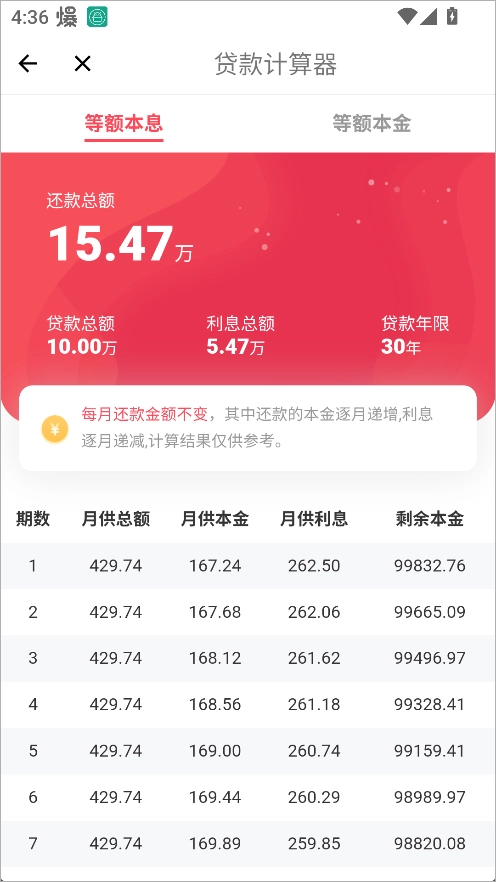 4、完成设置后,就能查看详细的房贷计算结果,像每月还款额以及利息情况都包含在内。