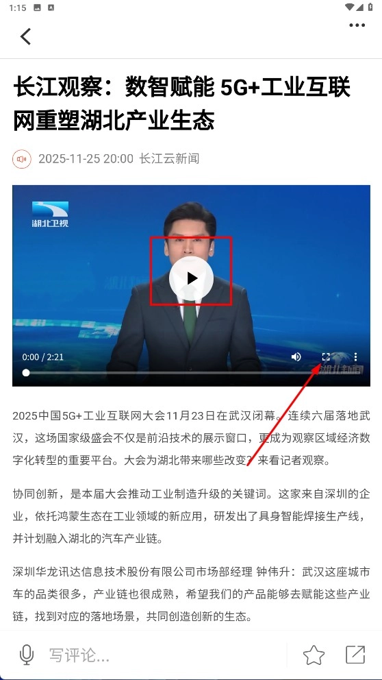 2、进入资讯详情页面后,点击视频区域的播放按钮,即可观看相关新闻视频,从而了解5G+工业互联网在产业领域的具体应用情况。