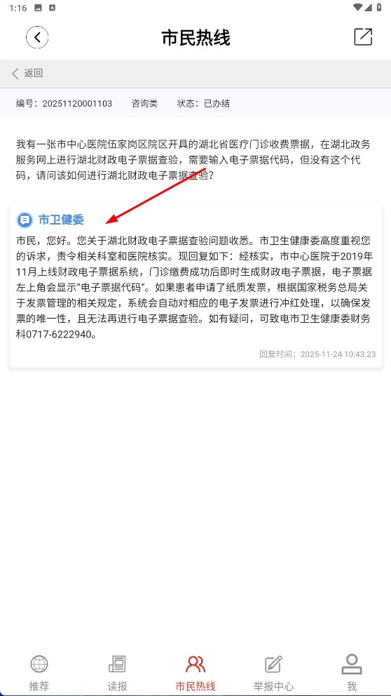 4、进入市民热线页面后,选择咨询类问题(例如“如何查验湖北财政电子票据?”),查看市卫健委等相关部门给出的回复,从中获取对应的解决办法。