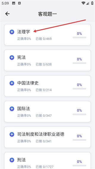 2、在客观题一页面找到【法理学】选项并点击,即可展开法理学的章节内容。