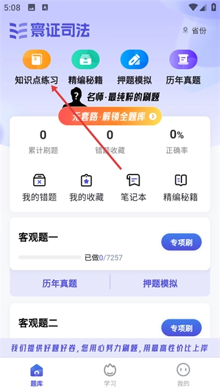 1、在题库页面点击【知识点练习】选项,进入客观题一页面。
